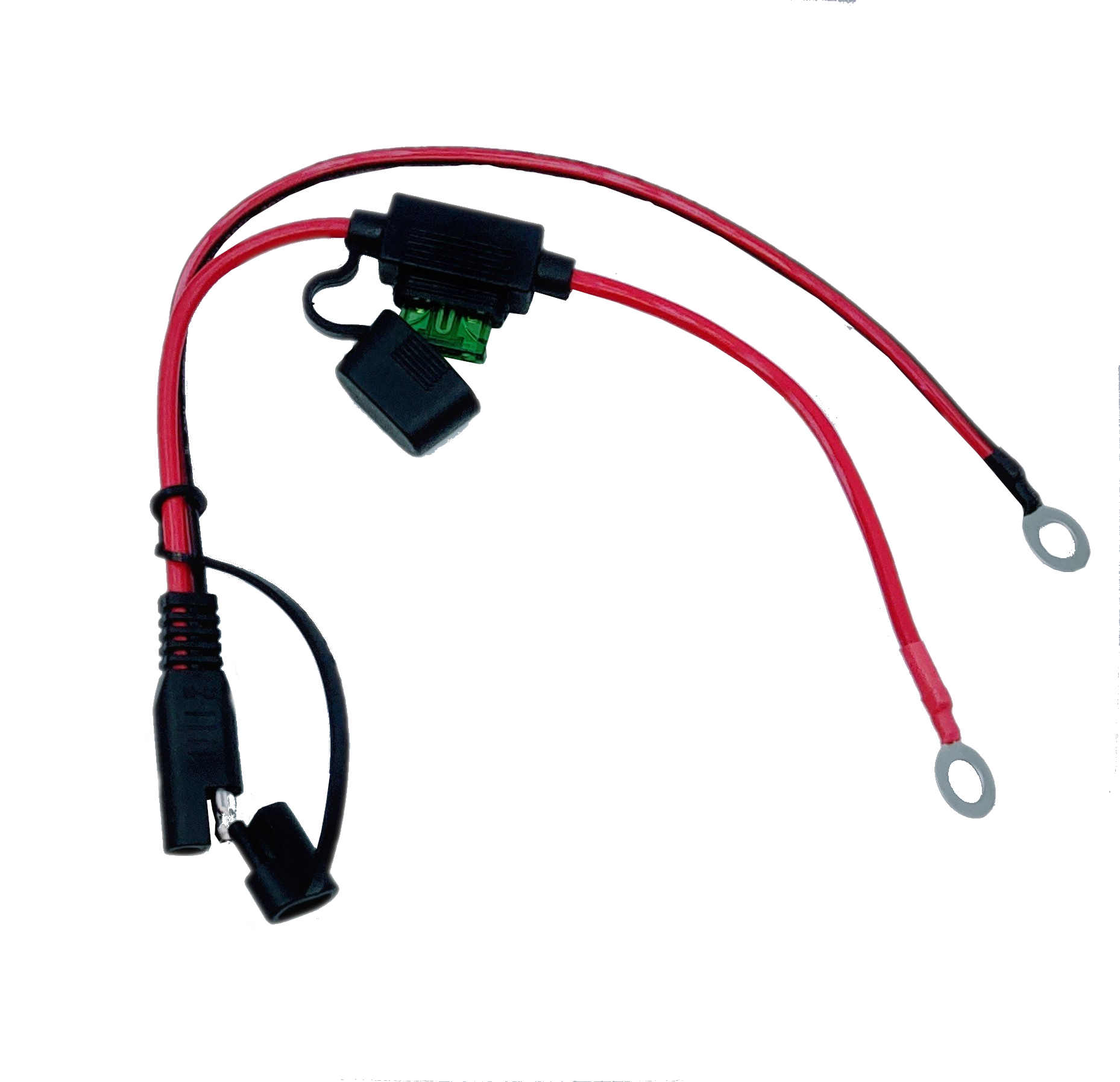 Made with heavy duty 10 AWG wire, with an inline fuse holder, this cable will withstand the high current required to safely jump start your bike from an external source, such as a lithium portable battery. It also functions as an ordinary battery SAE style harness to connect any trickle charger or accessories such as heated gear.